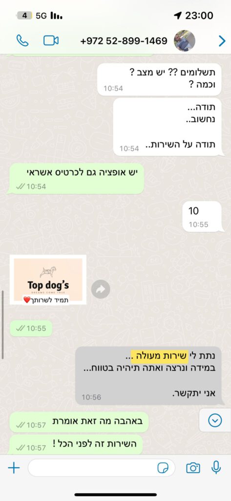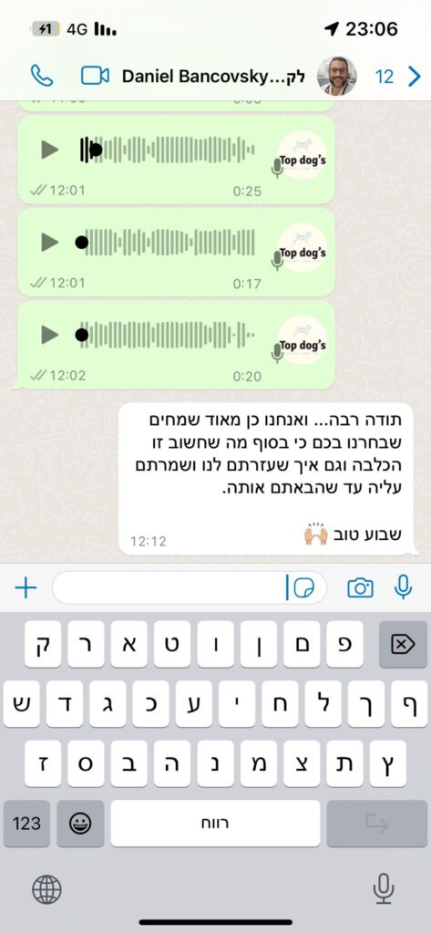 חברת Top dog's מומחים במציאת גור החלומות לכל בית ובית . בעזרת בירור צרכים מעמיק אנו מתאימים ללקוחותינו את סוג הכלב המתאים ביותר . אנחנו בחברה תומכים באהבה וחיזוק כלבים וגורים כאחד ועוזרת במציאת בית חם לכל גור וגור . המוטו של החברה שלנו הוא אמינות , אנו דוגלים בשקיפות מלאה מול קהל לקוחותינו ומלווים אותם לאורך כל תהליך מציאת הכלב המושלם , כי אין חלום שאי אפשר להגשים !